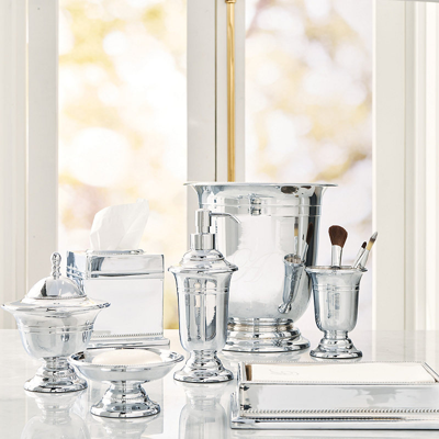 Inspired by a vintage mint julep cup that we thought was much too pretty for a once-a-year indulgence, our Maison Countertop Collection brings that elegance into the bath. Impeccably crafted of solid brass with intricate beading and classic banding. Thick-gauge solid brass construction with intricate detailing . Resistant to rust and corrosion . Monogram available on Soap Dispenser, Tissue Cover and Wastebasket . Slightly higher profile that complements luxury faucets. In Chrome, Brushed Nickel and Brushed Brass . Clean with a soft, damp cloth . For best results, periodically flush Soap Dispenser pump with water . Imported. Please note: Personalized items are non-returnable.
