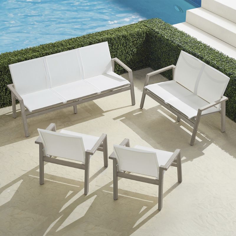 We engineered our generously scaled Frontgate Resort Collection Newport Teak Seating to stand the test of time while providing quality comfort. The sleek frame is crafted of sustainably harvested, high-quality weathered teak, which is strong and substantial but lightweight. The seamless, premium-quality sling seat is supportive, yet giving, allowing air to circulate and keep you cool while you relax. Part of the Frontgate Resort Newport Collection . Resort Newport 4-piece Teak Sofa Set: (175975_WHI): Includes sofa, loveseat and two lounge chairs . Hand-built from sustainably harvested, high-quality weathered teak that is naturally resistant to mildew, so it holds up to rain and humidity. Durable teak frame is kiln dried to remove moisture, guarding against warping and cracking, and sanded by hand so its smooth to the touch. Over time, teak will develop a natural silver patina if left untreated. Frame is backed by an industry-leading 10-year structural warranty. Quick-drying mesh sling allows air to circulate. Clean sling with a solution of liquid dish detergent and household bleach mixed in a gallon of water; wash with a sponge or soft cloth, rinse with clean water and then air dry. Arrives assembled. Imported. A Frontgate exclusive.