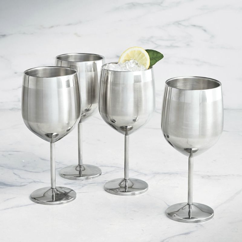 The double-walled stainless steel construction guarantees maximum cold retention for any type of beverage. Go coaster-free, as these wine glasses wont leave any messy condensation rings on tabletops or fine furnishingsDouble-walled stainless steel. 18 oz. capacity each. Sold as set of four. For indoor or outdoor use. Hand wash only. Do not use abrasive cleaner. Do not soak in water. Coordinates with the Optima Collection . A Frontgate exclusive.At Frontgate, our primary focus is quality. We guarantee that every product we sell will stand up to the supreme test our customers' satisfaction. To learn more about our policies, visit our Shipping & Processing, Returns & Exchanges and Warranty & Price Guarantee pages.