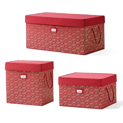Our Ornament Storage Set has everything you need to preserve your holiday treasures year after year. It includes three durable, stackable storage chests with multiple trays and spaces to safely hold your ornaments. Red canvas exteriors feature a gold foil design and easy-carry canvas handles, and the interior is lined with a matching soft red fabric.Includes Deluxe Oversized Ornament Storage Chest, Deluxe Ornament Storage Chest and Ornament & Greenery Storage Trunk. Deluxe Oversized Ornament Storage Chest: Three tiers. Holds up to 18 ornaments (up to 6" dia. each). Deluxe Ornament Storage Chest: Three-tier design. Standard holds up to 60 ornaments (up to 4" dia. each). Oversized holds up to 18 ornaments (up to 6" dia. each). Ornament & Greenery Storage Trunk: Two divided, stackable trays. Holds up to 16 ornaments (up to 4-1/2" dia. each). Canvas exterior around cardboard. Soft fabric interior. Gold foil design. Easy-carry canvas handles. Stackable. Spot clean with mild detergent; allow to completely air dry. Imported. A Frontgate exclusive.. At Frontgate, our primary focus is quality. We guarantee that every product we sell will stand up to the supreme test our customers' satisfaction. To learn more about our policies, visit our Shipping & Processing, Returns & Exchanges and Warranty & Price Guarantee pages.