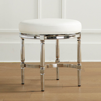 Sitting at the perfect height for use with your vanity or desk, this stool features a comfortably padded and upholstered seat on a sturdy, finished-iron base with inward-curving stretchers for extra foot room. It also has a 360 degrees swivel feature and built-in, nonmarring floor guides to help protect your floor. Precision-tuned, finished-iron base with White Faux Leather Seat. Faux leather easily wipes clean. 360 degrees swivel seat. Nonmarring floor glides. Maximum weight capacity: 250 lbs.. For indoor use. Arrives assembled. Wipe clean with a soft, damp cloth and mild detergent; avoid abrasive cleaners. Imported. A Frontgate exclusive.