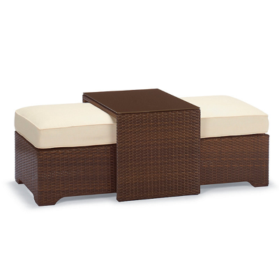 Complete the ensemble with our versatile Palermo Coffee Table with Nesting Ottomans the perfect trio for our Palermo Seating Collections. Two small square ottomans gracefully tuck below a large coffee table. All three are wrapped in metallic bronze wicker, from tabletop to the bottom of each of their sleigh legs. The industrys best high-performing fabrics encase each of the ottomans thick, double-wrapped foam cushions. Part of the Palermo Collection.Three-piece accent table and ottoman set. Multifaceted metallic bronze fibers . Handwoven premium resin wicker . Rust-resistant powdercoated frame . Tempered glass top on table . Easy-slide sleigh legs . Proportioned to nestle beautifully and look sensational individually . Ottoman cushions included . 100% solution-dyed acrylic and woven fabrics . All-weather cushions have a high-resiliency foam core wrapped in plush polyester . Cushions also available with 100% waterproof Sunbrella Rain performance fabric. Imported. Please note: Digital renderings of custom upholstery may differ in pattern placement from the actual item. Because colors can vary from screen to screen, we recommend ordering a swatch before completing your order. We offer free swatches of all our outdoor fabrics. 10-swatch maximum. Solid and stripe swatches measure 4"x4" and pattern swatches measure 8"x8". View and order swatches here.
