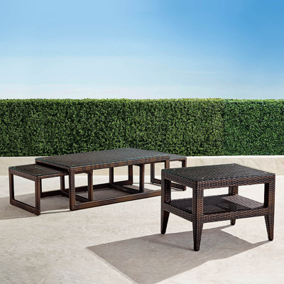 Our Palermo Bronze Tables feature all-weather wicker concealing durable cast-aluminum frames. Each piece is handwoven in bronze wicker from the tabletops to the bottom of each leg. Pair with the Palermo Seating or the Palermo Modular Seating in Bronze. All-weather wicker is handwoven over a powdercoated aluminum frame. Premium wicker construction resists mold, mildew, fading and splintering. Tempered glass tops. The Glass-overlay Side Table features a lower shelf and glass top . The Nesting Coffee Tables feature two small square tables neatly tucked below a large coffee table; all feature glass tops . A Frontgate exclusive.