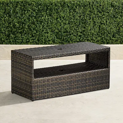 Our Palermo Bronze Umbrella Table features all-weather wicker concealing a durable cast-aluminum frame. Handwoven in bronze wicker for both style and function. Part of the Palermo Collection. All-weather wicker is handwoven over a powdercoated aluminum frame. Premium wicker construction resists mold, mildew, fading and splintering. Bronze wicker finished by hand. Adjustable feet for leveling. 2" umbrella hole with cap. Accommodates umbrellas up to 9 and poles up to 2" in diameter. Base is weighted for stability. Integrated open shelf. Long table is perfect for in between two chaises. Coordinates with Palermo Chaise. Always close umbrella when not in use, or in inclement weather. To prevent injuries or damage to item, recommended team lift (two or more people) for furniture placement. Wipe clean with a damp cloth; avoid harsh or abrasive chemicals that may damage the finish. Arrives assembled. A Frontgate exclusive. At Frontgate, our primary focus is quality. We guarantee that every product we sell will stand up to the supreme test our customers' satisfaction. To learn more about our policies, visit our Shipping & Processing, Returns & Exchanges and Warranty & Price Guarantee pages.