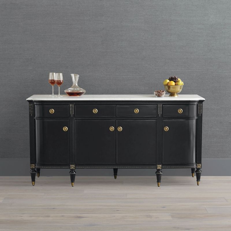Inspired by neoclassical antiques, our Regency Sideboard features handpainted gold beading catches, bow-shaped drawers, handcarved corners and a gorgeously veined Carrara marble top. Built of solid mahogany and mahogany veneer with a high-sheen ebony finish. Part of the Regency Collection Solid mahogany and mahogany veneer in Glossy Ebony finish. Gold accented corner carvings. Carrara marble top. Due to natural variations in marble, each piece is inherently unique. Handpainted gold beading. Circular brass drawer pulls. Full extension, soft-close drawers. Adjustable soft-close doors. Four bow-front drawers with natural finish inside. Four adjustable two-sided shelves: one side of the shelf is flat; the other side has slots suitable for wine bottles. Integrated power strip on the back of the sideboard with two power outlets and two USB ports. Integrated cord management. Levelers on feet. Fluted legs. Coordinates with the Regency Nightstand and Regency 4-Drawer Bow Front Chest . Included anti-tip kit is required for installation; kit consists of safety-tested mounting hardware, a nylon strap and instructions. To prevent injuries from furniture tipping over, this item must be permanently affixed to the wall; professional installation is recommended. To prevent injuries or damage to item, recommended team lift (two or more people) for furniture placement. Assembly required. A Frontgate exclusive. At Frontgate, our primary focus is quality. We guarantee that every product we sell will stand up to the supreme test our customers' satisfaction. To learn more about our policies, visit our Shipping & Processing, Returns & Exchanges and Warranty & Price Guarantee pages.