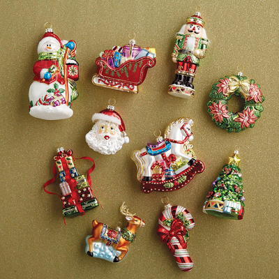 This curated assortment of glass ornaments will fill your holiday decor with the most iconic Christmas characters and symbols. Each intricately detailed ornament is handpainted in bright colors and hand-embellished with glitter for extra holiday sparkle. 100% glass. Hand decorated . Glitter. Metal cap. Store in original packaging or ornament storage box (sold separately). Wipe clean with a soft, dry cloth. Imported. A Frontgate exclusive.