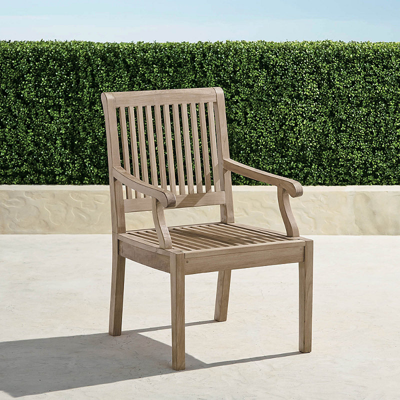The comfortable scale and smoothly sanded teak of our Cassara Dining Arm Chair will be around for a lifetime of memorable meals. The arm chair is handcrafted of high-quality teak that has been kiln dried to eliminate expansion and shrinkage. Stainless steel hardware is fully concealed, so nothing interrupts the clean, smooth lines. Optional chair cushion is covered in the industry s best all-weather fabrics. Part of the Cassara Weathered Collection. Estate-size seating . Hand-built from sustainably harvested, high-quality teak that is naturally resistant to mildew, so it holds up to rain and humidity. Durable teak frame is kiln dried to remove moisture, guarding against warping and cracking, and sanded by hand so its smooth to the touch. Teak naturally releases resinous oils as it weathers; using a rug is recommended to help prevent staining of deck or patio surfaces. Finely sanded finish . Fully-concealed stainless steel hardware . Teak will develop a lovely silver patina if left untreated . Cushion sold separately . Cushions also available with 100% waterproof Sunbrella Rain performance fabric. 100% solution-dyed and woven fabrics . Cushions have a high-resiliency foam core wrapped in plush polyester . Assembly required . Please note: Digital renderings of custom upholstery may differ in pattern placement from the actual item. Because colors can vary from screen to screen, we recommend ordering a swatch before completing your order. We offer free swatches of all our outdoor fabrics. 10-swatch maximum. Solid and stripe swatches measure 4"x4" and pattern swatches measure 8"x8". View and order swatches here. Imported/USA.