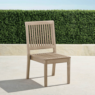 The comfortable scale and smoothly sanded teak of our Cassara Dining Arm Chair will be around a lifetime of memorable meals. The side chair is handcrafted of high-quality teak that has been kiln dried to eliminate expansion and shrinkage. Stainless steel hardware is fully concealed, so nothing interrupts the clean, smooth lines. Optional chair cushion is covered in the industry s best all-weather fabrics. Part of the Cassara Weathered Collection. Estate-size seating . Hand-built from sustainably harvested, high-quality teak that is naturally resistant to mildew, so it holds up to rain and humidity. Durable teak frame is kiln dried to remove moisture, guarding against warping and cracking, and sanded by hand so its smooth to the touch. Teak naturally releases resinous oils as it weathers; using a rug is recommended to help prevent staining of deck or patio surfaces. Finely sanded finish . Fully-concealed stainless steel hardware . Teak will develop a lovely silver patina if left untreated . Stacks for storage . Cushion sold separately . Cushions also available with 100% waterproof Sunbrella Rain performance fabric. 100% solution-dyed and woven fabrics . Cushions have a high-resiliency foam core wrapped in plush polyester . Assembly required . Please note: Digital renderings of custom upholstery may differ in pattern placement from the actual item. Because colors can vary from screen to screen, we recommend ordering a swatch before completing your order. We offer free swatches of all our outdoor fabrics. 10-swatch maximum. Solid and stripe swatches measure 4"x4" and pattern swatches measure 8"x8". View and order swatches here. Imported/USA.
