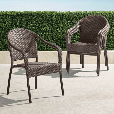 <!-- -->Our full-scale, lightweight Cafe Curved-back Stacking Chairs create an elegant outdoor setting at a moments notice. Advanced weather-defying fiber is double woven over powdercoated aluminum frames to create the rich look of wicker without the worries. All-weather wicker is handwoven over a powdercoated aluminum frame. Premium wicker construction resists mold, mildew, fading and splintering. Durable yet lightweight aluminum frame is finished with a protective powdercoat to resist the elements. Frame is backed by an industry-leading 10-year structural warranty. Curved chairs are larger and infinitely more comfortable than typical stacking chairs Stacks for space-saving storage. Golden bronze metallic sheen . Cushions sold separately. All-weather cushions have a high-resiliency foam core wrapped in plush polyester. 100% solution-dyed fabric resists mold, mildew and fading and is easy to clean. Imported. A Frontgate exclusive.