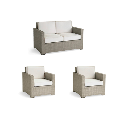 Outstanding comfort and structural integrity make our Small Palermo 3-piece Loveseat Set a welcome addition smaller outdoor spaces. Dove fibers are smoothly double woven around concealed powdercoated aluminum frames. Gently angled backs and wide arms encourage restful lounging. The industrys best high-performing fabrics encase the thick, double-wrapped foam cushions.Part of the Small Palermo Dove Collection. Small Palermo 3-piece Loveseat Set in Dove Finish (162985_DOV): Includes loveseat and two lounge chairs with cushions. Note: Set only available as listed.. Comfortably sized for balconies and smaller outdoor spaces. Dove finish. Handwoven premium resin wicker. Rust-resistant powdercoated frame. Cushions included. 100% solution-dyed acrylic and woven fabrics. All-weather cushions have a high-resiliency foam core wrapped in plush polyester. Cushions also available with 100% waterproof Sunbrella Rain performance fabric. Imported . A Frontgate exclusive.Please note: Digital renderings of custom upholstery may differ in pattern placement from the actual item. Because colors can vary from screen to screen, we recommend ordering a swatch before completing your order. We offer free swatches of all our outdoor fabrics. 10-swatch maximum. Solid and stripe swatches measure 4"x4" and pattern swatches measure 8"x8". View and order swatches here.