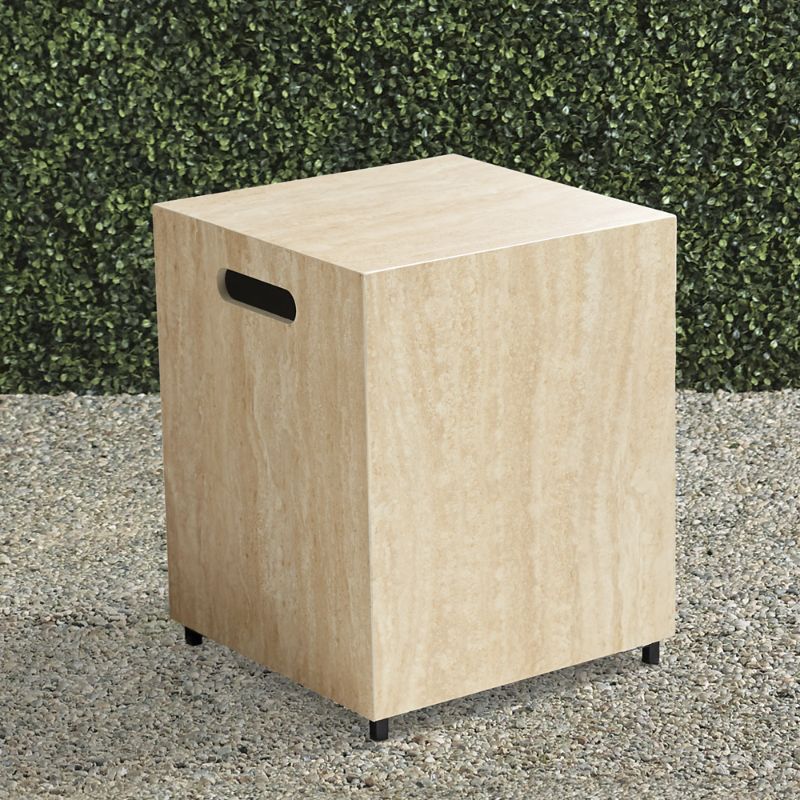 <div class="updp-details-container">Crafted of travertine sintered stone, this cover cleverly conceals a 20-pound propane tank for use with an adjacent fire table (sold separately).Travertine sintered stone. Stone is nonporous with a zero-absorption level, making it stain-resistant and easy to clean and maintain. Stone is resistant to scratches, abrasions and harsh chemicals, such as detergents and cleaning agents. Conceals a 20 lb. propane tank for use with a fire table (not included). Coordinates with our Tangier Fire Table . Doubles as a side table. Frontgate Safety Recommendations. <b class="prop65warn"> WARNING: Combustion byproducts produced when using this product include carbon monoxide and other chemicals known to the State of California to cause cancer, birth defects, or other reproductive harm. For more information go to www.P65Warnings.ca.gov. A Frontgate exclusive.At Frontgate, our primary focus is quality. We guarantee that every product we sell will stand up to the supreme test our customers satisfaction. To learn more about our policies, visit our Shipping & Processing, Returns & Exchanges and Warranty & Price Guarantee pages.