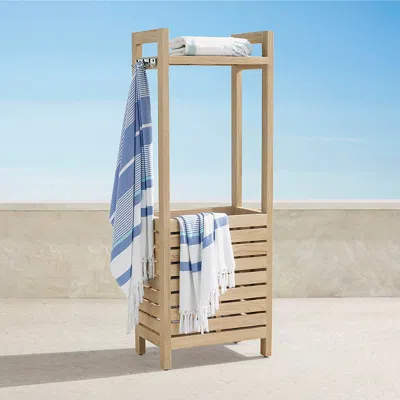 Crafted of slatted teak that promotes airflow and drying, our Frontgate Resort Collection Teak Pool Storage features a large slot for holding your pool floats and other accessories, and eight separate aluminum hooks for hanging and drying towels. The top shelf provides additional storage. Crafted of slatted teak. Weathered finish. Perfect for storing floats, noodles, pool toys, towels and other outdoor accessories. Rinse with water prior to first use. Imported. A Frontgate exclusive. At Frontgate, our primary focus is quality. We guarantee that every product we sell will stand up to the supreme test our customers' satisfaction. To learn more about our policies, visit our Shipping & Processing, Returns & Exchanges and Warranty & Price Guarantee pages.