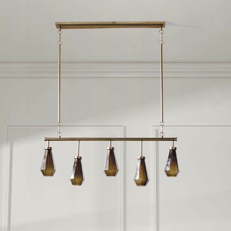 <div class="updp-details-container">This contemporary chic chandelier will elevate your decor without hesitation. With a burnished brass finish and angular detailing in each amber ombre glass shade, this piece will add brilliance to the decor of any room.Stainless steel with burnished brass finish. Amber ombre glass. Accommodates five 25-watt or LED equivalent T10 5.5" bulbs. E12 socket type. Pole Kit includes four 6", two 12" and two 18" rods for a total drop accommodation of 42". Hardwired (professional installation recommended). UL listed for damp environments. Compatible with a dimmer switch (not included). Wipe with dry cloth. A Frontgate exclusive.At Frontgate, our primary focus is quality. We guarantee that every product we sell will stand up to the supreme test our customers satisfaction. To learn more about our policies, visit our Shipping & Processing, Returns & Exchanges and Warranty & Price Guarantee pages.