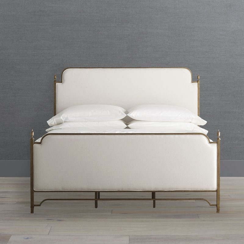 The Whitby Beds clean design, classic finials and a contemporary steel frame create a bed with timeless style that pairs with any decor. Arched lines in the headboard, footboard and stretchers frame the bed, while the linen-upholstered headboard and footboard provide soft, soothing accents.Iron frame with a antiqued textured brass finish. Headboard and footboard upholstered in linen with high-density foam fill. Four metal support slats. To prevent injuries or damage to item, recommended team lift (two or more people) for furniture placement . Designed to be used with a mattress and box spring. Assembly Required. Queen Assembly. King Assembly. Imported. A Frontgate exclusive.At Frontgate, our primary focus is quality. We guarantee that every product we sell will stand up to the supreme test our customers' satisfaction. To learn more about our policies, visit our Shipping & Processing, Returns & Exchanges and Warranty & Price Guarantee pages.