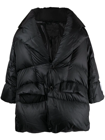 Black oversized quilted jacket from FUMITO GANRYU featuring notched collar, front button fastening, long sleeves, two front flap pockets and straight hem.