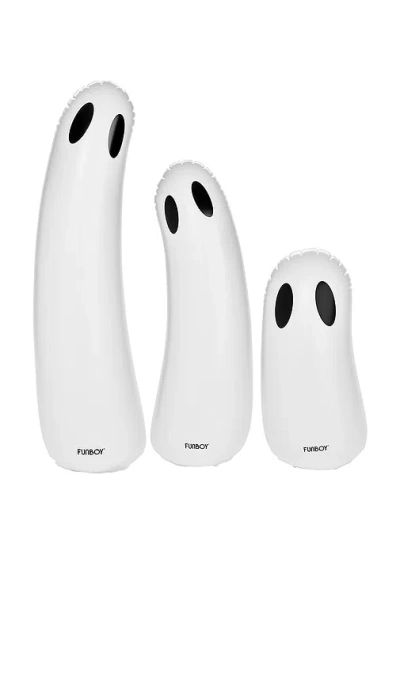 FUNBOY Standing Ghosts 3 Pack in White. FUNBOY Standing Ghosts 3 Pack in White. Bring the spooky fun home with the FUNBOY Halloween Ghosts 3-Pack - a modern twist on classic Halloween décor. This stylish inflatable ghost set includes three sizes (Large, Medium, and Small) to create a dynamic and eye-catching display. Whether you're decorating your front yard, porch, pool, or party space, these glowing ghosts add an eerie vibe with remote-controlled LED lights offering 10 color options, flashing effects, and dimming settings. Made for indoor and outdoor use, they feature weighted bases for easy setup and deflate for convenient off-season storage. Exclusive to FUNBOY, this chic set blends fright and fashion for a Halloween look that stands out. Batteries not included.. Each ghost features an integrated waterproof LED light case with 10 color options, 4 dynamic flash modes, and a dimmer function. Made with weather-resistant materials that deflate easily for compact storage. Durable design withstands mild cold and moisture. Weighted base keeps each ghost upright for effortless decorating. Small measures approx 13.5 W x 30 H. Medium measures approx 12.5 W x 40.5 H. Large measures approx 12.5 W x 46 H. FUNR-WH68. GHOST25-3SET. FUNBOY debuted Summer 2015, quickly selling out their debut line of feathered floats while defining a new luxury category. Designed in Los Angeles, FUNBOY's giant floats are pure and simple summer fun. Even better, each FUNBOY provides one person a year of clean drinking water in the developing world. Enjoy the float life.