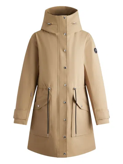 beige drawstring waist hooded neckline snap button fastening flap pockets long sleeves