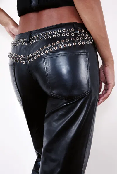 The Josephina Pant is cut low-rise in smooth lamb leather. Finished with pierced detailing and a classic five-pocket design, she’s sleek, edgy, and made to move with you.. 100% real lamb leather. Jasmine is 5'9" and wears a size S. Her measurements are: Bust-34” Waist-23.5” Hips-34”.. Green Dry Clean Only..