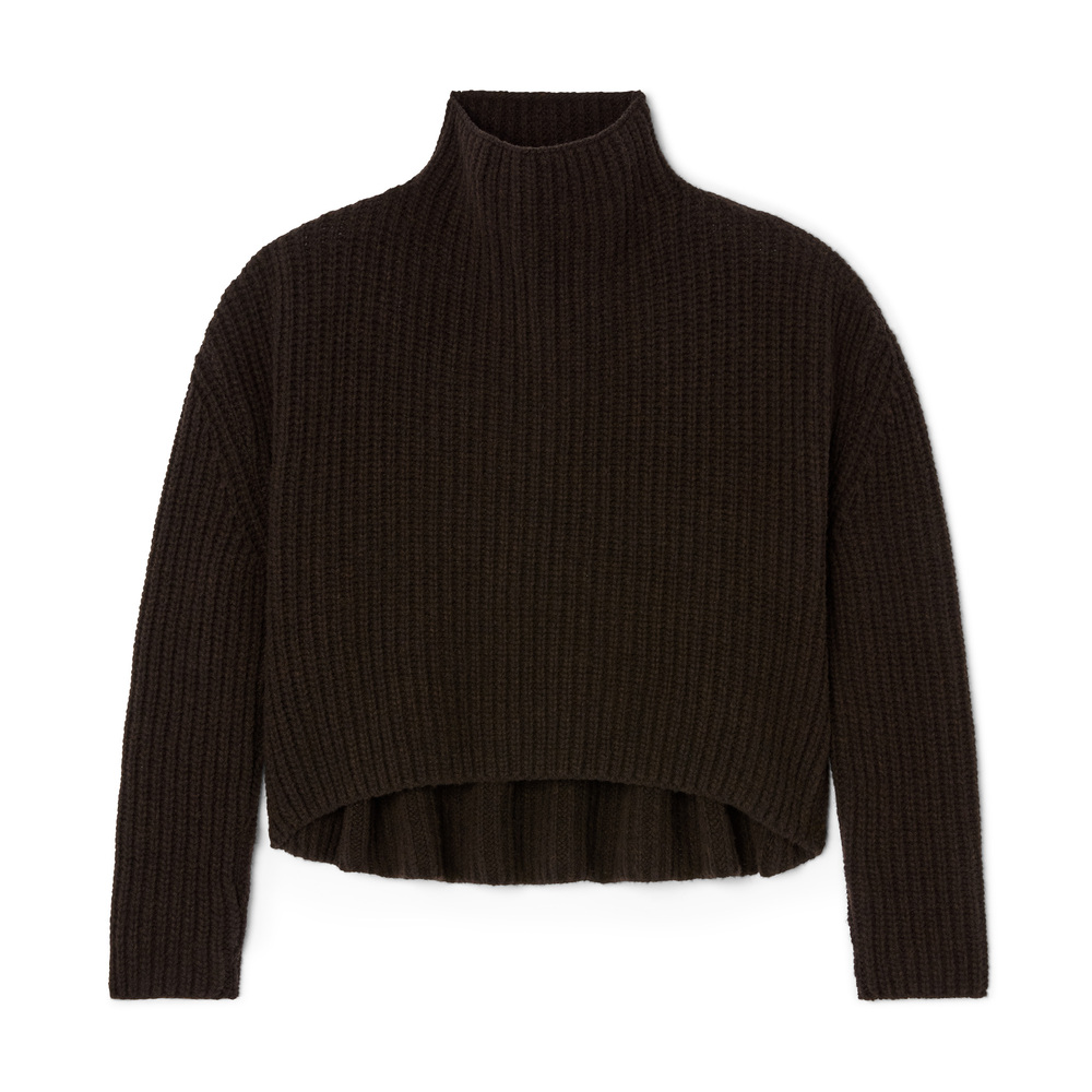 Sloane Sweater in Cacao Brown, Medium: This sweater is rib-knit from a two-ply wool-cashmere yarn we sourced specially from a mill in San Marino, Italy—it’s thick, lofty, and luxuriously soft. The silhouette is cozy and cocoon-like: There’s a relaxed mock neck, dropped shoulders, elongated sleeves, and a hem that’s slightly shorter in the front than in back. As for the color? It’s a cool-toned carob that plays nicely with just about anything on the color wheel. Pull this on whenever you need a little comfort—with trousers, jeans, skirts, sweats, whatever.90% virgin wool, 10% cashmere Made in Italy.