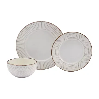This is a beautifully heavy embossed dinnerware set designed with an eclectic design pattern of mix and match. The dinner plate, salad plate, and bowl each have a different pattern that all work seamlessly together. On the rims of the dinner plate is a radiant sundial, the salad plate is fun embossed micro polka dot, and lastly, on the bowl is a quarter circle "scale" type effect that fills the outside body of the bowl. This dinnerware set is made from the finest stoneware, finished in a natural glaze for a watertight seal making this set perfect for any use. This glaze creates a non-porous layer making these sets virtually impermeable to liquid, stains, and odors.# Pieces In Set: 12Included: 4 8 1/2 Inch Salad Plate(s), 4 6 Inch Bowl(s), 4 10 3/4 Inch Dinner Plate(s)Features: Chip Resistant, Stackable, Microwave Safe, Dishwasher SafePlace Setting: Service for 4Shape: RoundBase Material: 100% StonewareCare: Dishwasher SafeDecor Styles: ModernMaterial: StonewareCountry of Origin: Imported