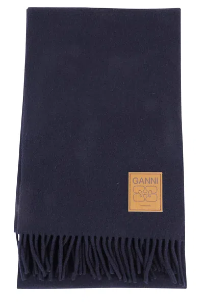 Scarf -Ganni -Color sky captain -Logo -Frange