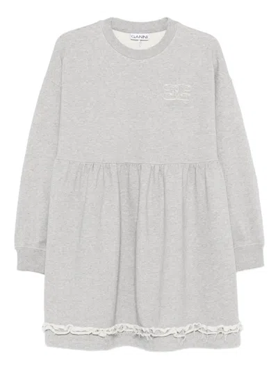 light grey crew neck long sleeves ruffled hem embroidery detail