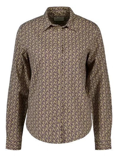 beige all-over pattern button fastening long sleeves point collar curved hem