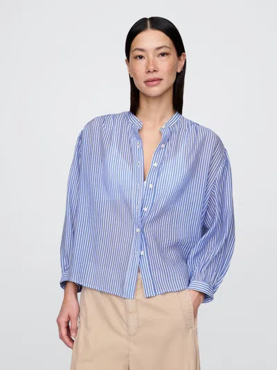 Soft, sheer tencel-blend button-down top. Band collar. Long sleeves with button closure. Button front. Certain styles have allover stripes. This product was made in a factory that invests in gender equality and women’s empowerment. Through RISE (Reimagining Industry to Support Equality) and Gap Inc. ’s program P. A. C. E. (Personal Advancement & Career Enhancement), we support people who make our clothes to build the skills, knowledge, confidence, and resilience needed to advance in work and life. Learn more. here. Fit: Relaxed. A straight & easy fit. For a Classic fit, go down one size. Hits at the hip. Models wearing Gap size S are 5'8"–5'11" (172–180 cm) with 23. 5–26" (60–66 cm) waist & 33–38" (84–97 cm) hips. Models wearing Gap size XL are 5'8"–5'11" (172–180 cm) with 34–36” (86–91 cm) waist & 45–50" (114–127 cm) hips.