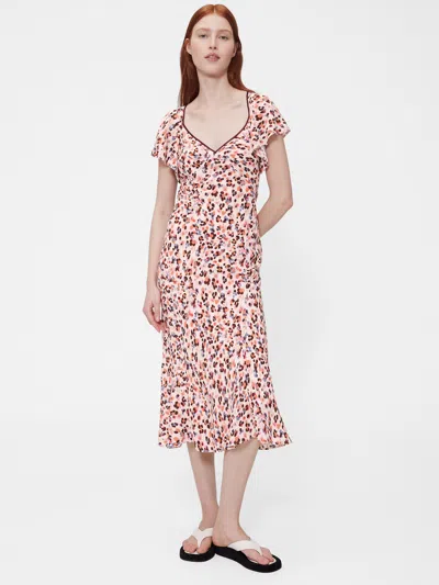 Soft rayon-viscose blend crepe midi dress. V-neck. Short flutter sleeves. Empire waist. Zipper at back. Allover abstract print. Made with 50% LENZING™ ECOVERO™ viscose fibers, which are derived from controlled or certified wood sources. Fit: Slim. A fit & flare silhouette that sits close to the body & flares at the waist. Midi length, hits below the knee. Models wearing Gap size S are 5'8"–5'11" (172–180 cm) with 23. 5–26" (60–66 cm) waist & 33–38" (84–97 cm) hips.