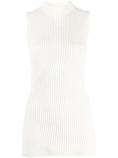 open-back ribbed top from Gauchère featuring off-white, knitted construction, ribbed knit, mock neck, sleeveless, open back, straight hem and cotton.