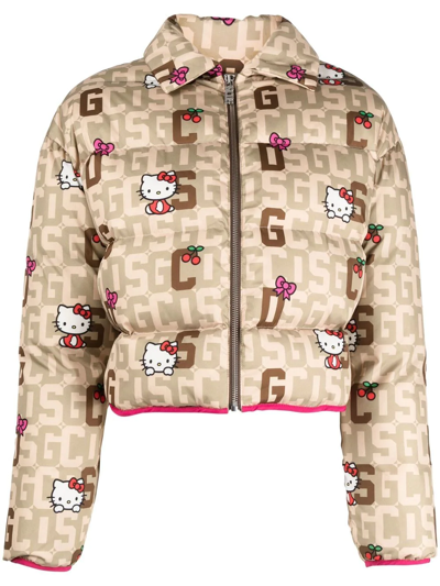 x Hello Kitty padded jacket from GCDS featuring beige, feather down, all-over logo print, padded design, classic collar, front zip fastening and long sleeves.