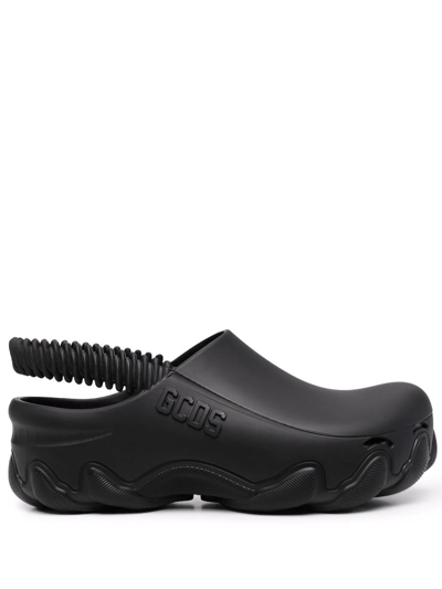 Black Ibex slingback clogs from GCDS featuring raised logo detail, round toe, slingback strap, moulded footbed, removable insole, chunky rubber sole and slip-on style.