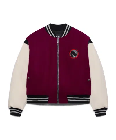 Varsity bomber with contrast sleeves. The model is finished with striped ribbed knit details on the collar, hem, and cuffs. Embroidered Kittho logo patch applied on the chest.