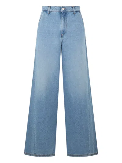 light blue concealed fly and button fastening two side slash pockets two rear patch pockets belt loops