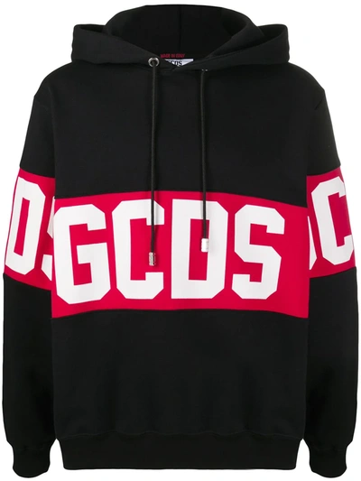 Black, white and red cotton logo drawstring hoodie from GCDS featuring a printed logo, a drawstring hood, long sleeves, fitted cuffs and a pull-on style.