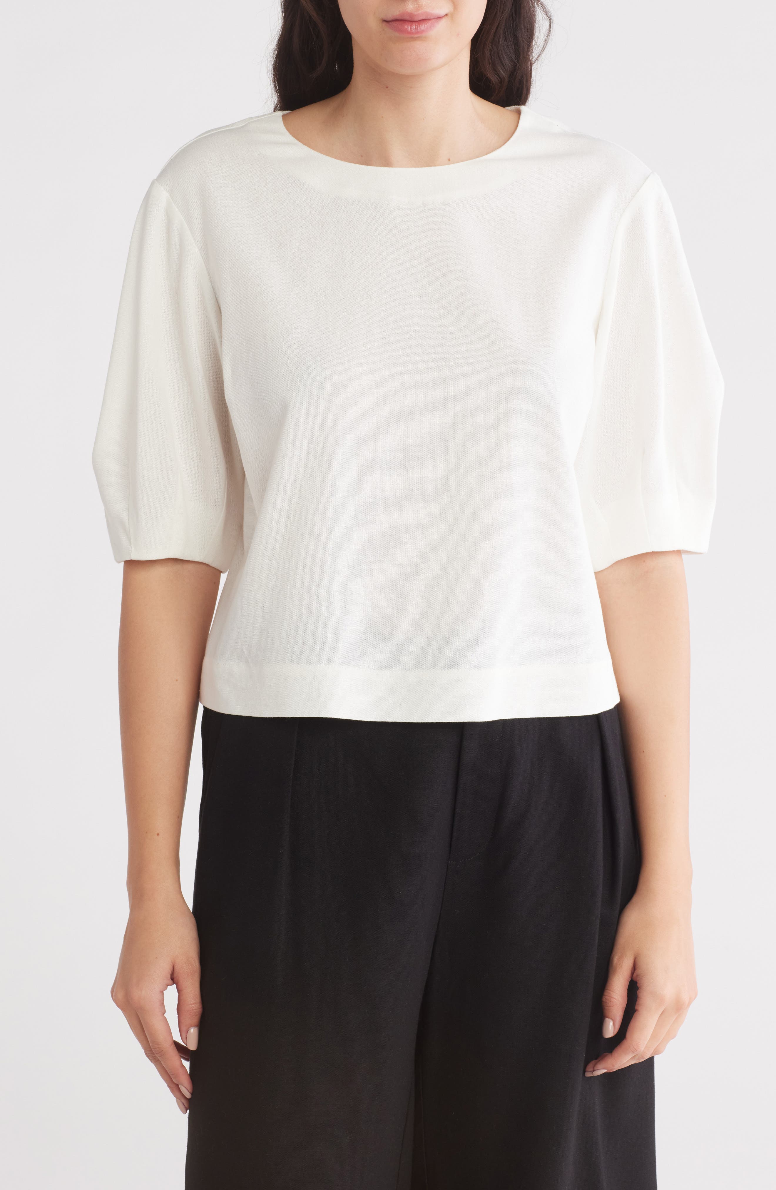 Elbow-length balloon sleeves add a polished look to this crewneck top made of a soft and breathable rayon and linen blend. Crewneck Elbow-length sleeves 85% rayon, 15% linen Machine wash, tumble dry Imported