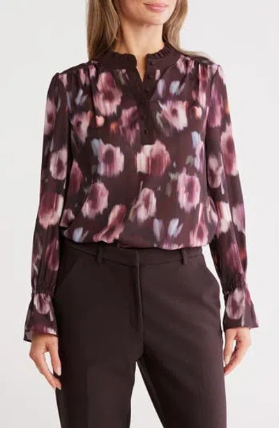 Flared cuffs lend chic drama to a billowy button-front top that's a sophisticated choice for office ensembles. Button half placket Ruffled band collar Long sleeves with elastic cuffs 100% polyester Machine wash, tumble dry Imported