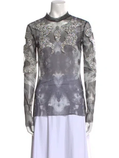 Germanier Top Lace Pattern Crystal & Mesh Accents Long Sleeve with Mock Neck Fit: Tops by Germanier typically fit true to size. | Germanier Lace Pattern Mock Neck Top, Women's M