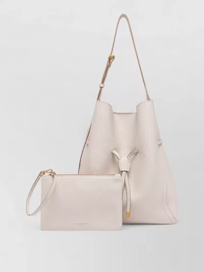 Pebbled texture | Adjustable strap | Gold-tone hardware | Detachable pouch | Drawstring closure
