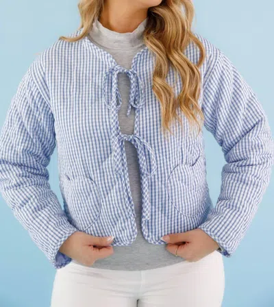 A casual yet cool jacket that every closset needs.Introducing the Bow Tie Jacket by GILLI, a sophisticated addition to your wardrobe in charming blue and white gingham. This casual jacket features long sleeves, a stylish tie closure, and is crafted from 97% Polyester and 3% Spandex for a comfortable fit. The design is completed by heart-shaped pockets, adding both functionality and flair. Care for this fully lined piece by hand washing it with cold water and laying it flat to dry. Mallory, the model, is wearing a size small.