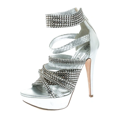 Pre-owned Silver Crystal Embellished Leather And Python Strappy Platform Sandals Size 37