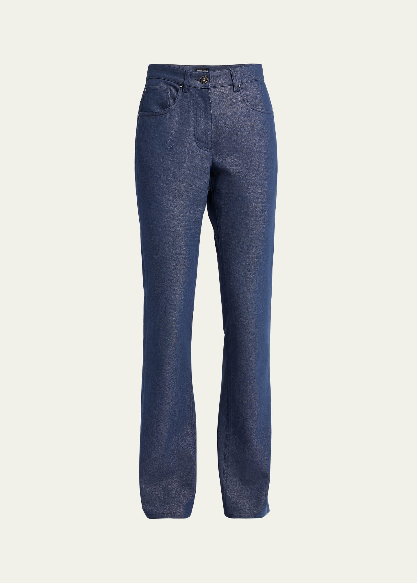 Giorgio Armani bootleg denim jeans features logo embroidery at the back pocket Mid-rise; sits high on hip Button/zip fly; belt loops Five-pocket style Straight legs Full length Relaxed fit Cotton/viscose Dry clean Made in Italy