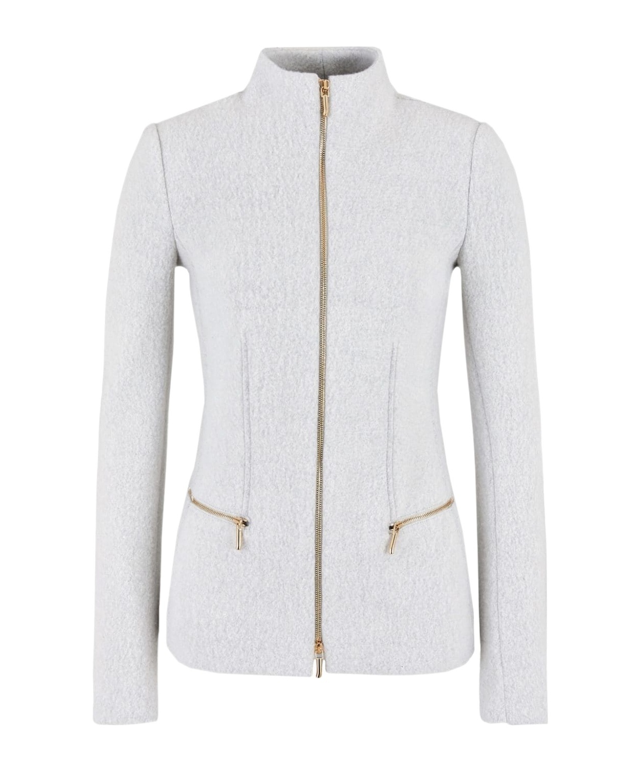 Slimline zipped jacket made of cotton, wool and cashmere double cloth. The style elegantly drapes over the silhouette and features a front zip closure, small upright collar and two front zipped pockets. The front rib detail accentuates the waist, elongating the silhouette. A sophisticated style designed to complete evening looks.