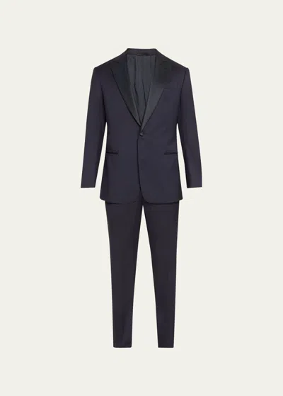 GIORGIO ARMANI Men's Silk-lapel Micro-pattern Suit In Solid Dark Blue