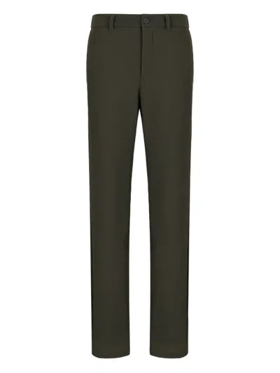 dark green textured belt loops button fastening side seam pockets back welt pockets