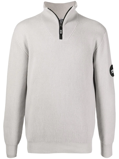 Off-white cashmere-virgin wool blend zip-front funnel neck jumper from GIORGIO ARMANI featuring funnel neck, front zip fastening, long sleeves and logo patch at the sleeve.