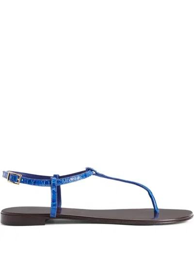 Cornflower-blue crocodile-print leather Light golden metal accessory and light golden metal buckle 10 mm-high heel. Glossy brown leather sole with logo