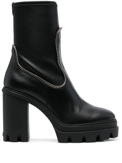 Giuseppe Zanotti boots in leather with zipper piping trim 3.15 in / 80 mm platform heel; 1.25 in / 30 mm platform Round toe Stretch collar Pull-on style Lugged rubber sole Made in Italy