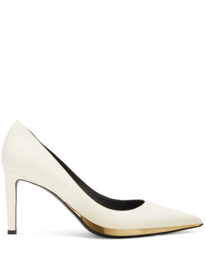 These pointed-toe pumps with stiletto heels, crafted from off-white leather, are embellished with a leather sole outlined by a golden mirror-effect detail on the outside.