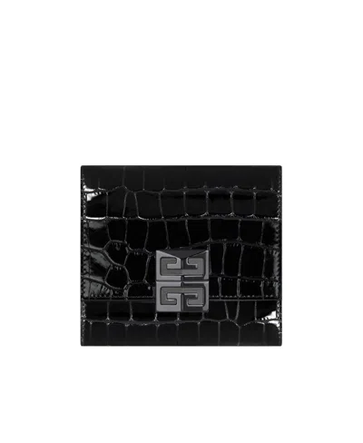 - Three-section wallet in crocodile-effect embossed calfskin leather. - 4G line. - Flap with metal 4G emblem. - Press-button closure. - Sivery GIVENCHY signature on the inside. - Ruthenium-finish metal details. - One zipped coin pocket with GIVENCHY 4G zipper pull. - One flat bill pocket and four card slots.